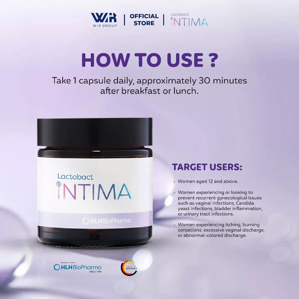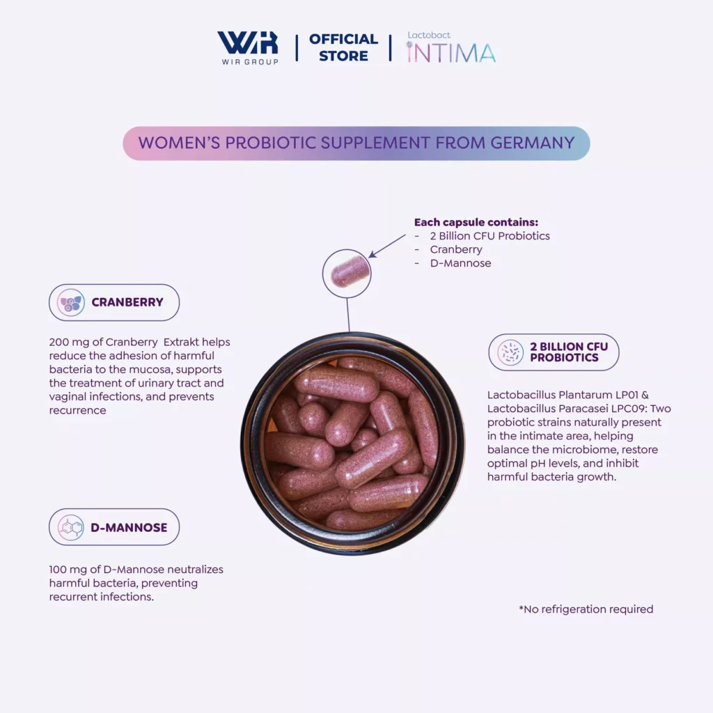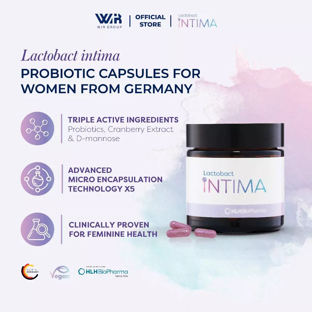 Lactobact® Intima is a premium women’s probiotic supplement developed in Germany, specially designed to support vaginal health, urinary tract protection, and overall intimate wellness. Each capsule delivers a powerful blend of 2 billion live microencapsulated probiotics, 200 mg Cranberry Extract, and 100 mg D-Mannose — creating a clinically backed, triple-action defence system.